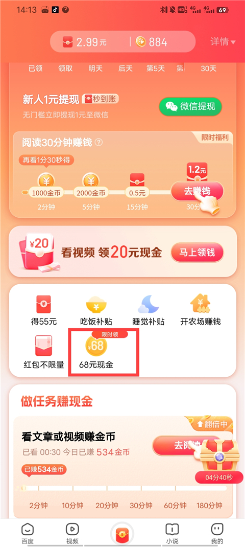 1、进入百度极速版领现金app,我们点击下方的红包图标中,往下滑动,里面为用户提供了很多赚钱活动,我们点击68元现金;
